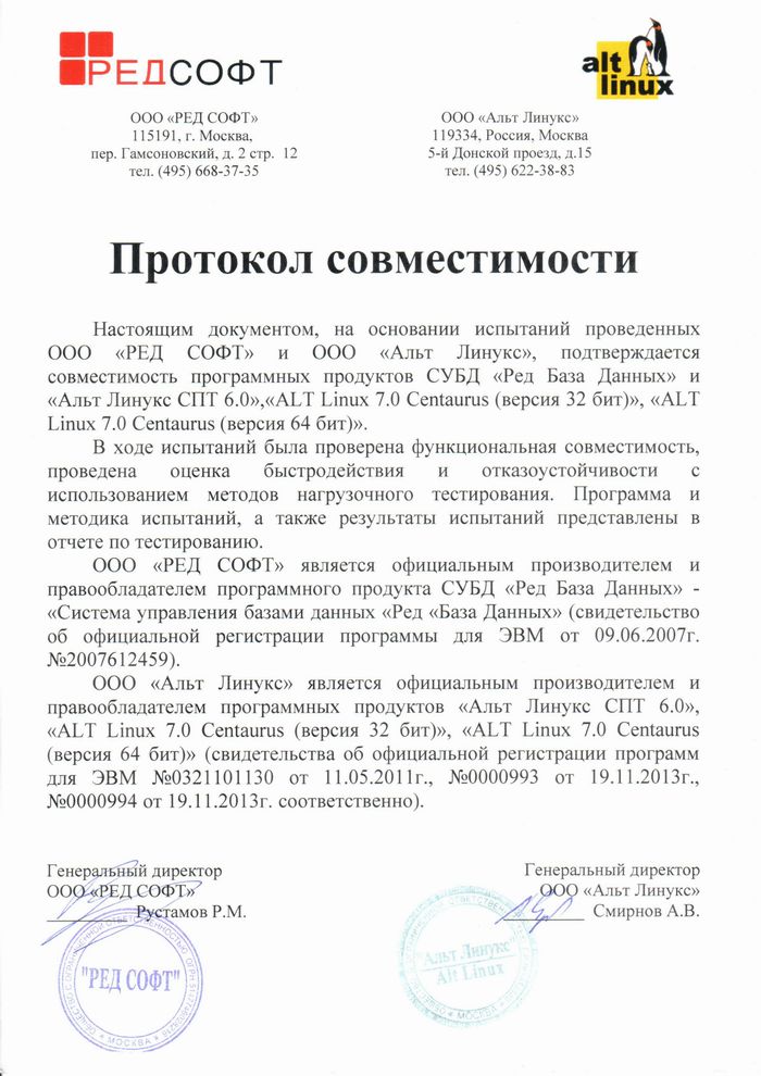 Компания Ред Софт и Альт Линукс (http://www.altlinux.ru) завершили совместные испытания и подписали протокол совместимости, подтверждающий совместимость программных продуктов СУБД «Ред База Данных» и «Альт Линукс СПТ 6.0»,«ALT Linux 7.0 Centaurus (версия 32 бит)», «ALT Linux 7.0 Centaurus (версия 64 бит)». В ходе испытаний была проверена функциональная (программная) совместимость, проведена оценка быстродействия и отказоустойчивости с использованием методов нагрузочного тестирования. ООО «Альт Линукс» является официальным производителем и правообладателем программных продуктов «Альт Линукс СПТ 6.0», «ALT Linux 7.0 Centaurus (версия 32 бит)», «ALT Linux 7.0 Centaurus (версия 64 бит)»